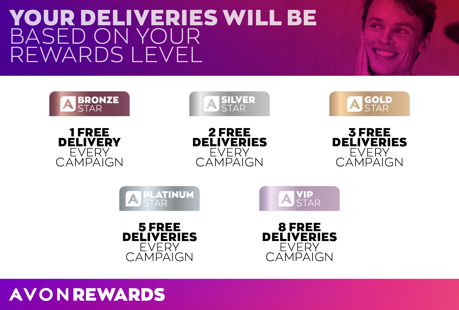 Reps can get free deliveries every campaign – the higher your Rewards level, the more free deliveries you’ll receive.